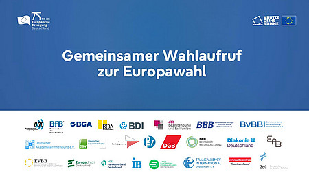 Wahlaufruf zur Europawahl 2024 der Europäischen Bewegung Deutschland e.V. gemeinsam mit BBE, BDA, BFB, BGA, BDI, dbb, BBB, BVBBI, DAB, DBV, DBJR, DF, DGB, DNR, EWDE, EAB, EVBB, EUD, HDE, IB, JEF, TI, vzbv, ZdK
