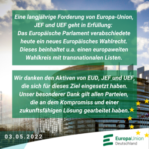 Eine langjährige Forderung von Europa-Union, JEF und Union Europäischer Föderalisten ist heute in Erfüllung gegangen: Das Europäische Parlament verabschiedete ein neues Wahlrecht für die Europawahl 2024. Es sieht unter anderem die Schaffung eines europaweiten Wahlkreises vor. Mit einer zweiten Stimme können die Wählerinnen und Wähler künftig eine europaweite Liste wählen. 28 Mandate sollen auf diese Weise vergeben werden. Über die transnationalen Listen sollen auch die von ihren Parteienfamilien aufgestellten europäischen…